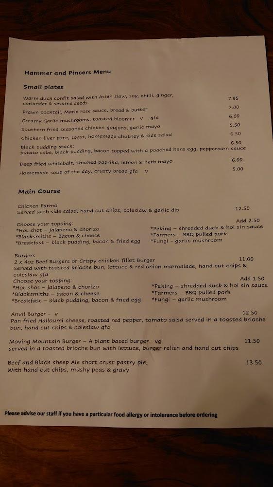 The menu at The Hammer and Pincers features an impressive variety of options that cater to all tastes and preferences. For small plates, the deep-fried breaded brie wedges and prawn cocktail are standout favorites. Sandwich lovers frequently rave about the bacon, brie, and cranberry creation and the house burger options, which boast rich flavors and generous portions. Vegetarians will find delightful choices, including the goats cheese and roasted vegetables sandwich.